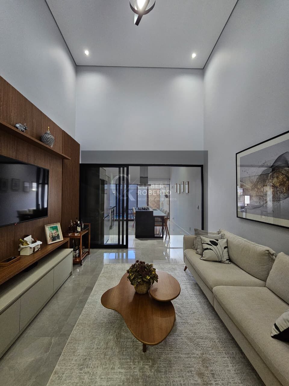 Sala de TV com pé direito alto, proporcionando excelente amplitude